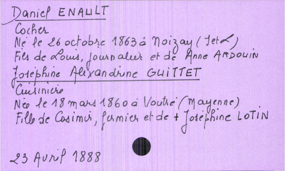 train | Tours | Index cards | f32c595d-44e2-45d9-b162-efaa74e02cba | <root><Mariage><Marié><Nom>Enault</Nom><Prénom>Daniel</Prénom><Profession>cocher</Profession><DateDeNaissance>26 octobre 1863</DateDeNaissance><LieuDeNaissance>Noizay (Indre et Loire)</LieuDeNaissance><Père><Nom>Enault</Nom><Prénom>Louis</Prénom><Profession>journalier</Profession></Père><Mère><Nom>Ardouin</Nom><Prénom>Anne</Prénom></Mère></Marié><Mariée><Nom>Guittet</Nom><Prénom>Joséphine Alexandrine</Prénom><Profession>cuisinière</Profession><DateDeNaissance>18 mars 1860</DateDeNaissance><LieuDeNaissance>Voutré (Mayenne)</LieuDeNaissance><Père><Nom>Guittet</Nom><Prénom>Casimir</Prénom><Profession>fermier</Profession></Père><Mère><Nom>Lotin</Nom><Prénom>Joséphine</Prénom><Statut>décédée</Statut></Mère></Mariée></Mariage><Année>1888</Année><Mois>avril</Mois><Jour>23</Jour></root> | |