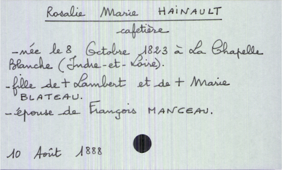 train | Tours | Index cards | 7bae4e48-e067-4db4-85d3-b16f358ec5e5 | <root><Décès><Défunt><Nom>Hainault</Nom><Prénom>Rosalie Marie</Prénom><DateDeNaissance>8 octobre 1823</DateDeNaissance><LieuDeNaissance>La Chapelle Blanche (Indre-et-Loire)</LieuDeNaissance><Profession>cafetière</Profession><Statut>marié(e)</Statut></Défunt><Conjoint><Nom>Manceau</Nom><Prénom>François</Prénom></Conjoint><Père><Nom>Hainault</Nom><Prénom>Lambert</Prénom><Statut>décédé</Statut></Père><Mère><Nom>Blateau</Nom><Prénom>Marie</Prénom><Statut>décédée</Statut></Mère></Décès><Année>1888</Année><Mois>août</Mois><Jour>10</Jour></root> | |
