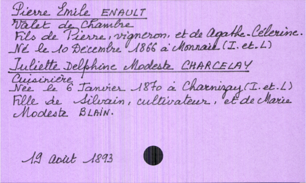 train | Tours | Index cards | 5bcdb322-f3ea-435e-a41a-b2b1bb92d037 | <root><Mariage><Marié><Nom>Enault</Nom><Prénom>Pierre Emile</Prénom><Profession>valet de chambre</Profession><DateDeNaissance>10 décembre 1866</DateDeNaissance><LieuDeNaissance>Monnaie (Indre-et-Loire)</LieuDeNaissance><Père><Nom>Enault</Nom><Prénom>Pierre</Prénom><Profession>vigneron</Profession></Père><Mère><Nom>Célerine</Nom><Prénom>Agathe</Prénom></Mère></Marié><Mariée><Nom>Charcelay</Nom><Prénom>Juliette Delphine Modeste</Prénom><Profession>cuisinière</Profession><DateDeNaissance>6 janvier 1870</DateDeNaissance><LieuDeNaissance>Charnizay (Indre-et-Loire)</LieuDeNaissance><Père><Nom>Charcelay</Nom><Prénom>Silvain</Prénom><Profession>cultivateur</Profession></Père><Mère><Nom>Blain</Nom><Prénom>Marie Modeste</Prénom></Mère></Mariée></Mariage><Année>1893</Année><Mois>août</Mois><Jour>19</Jour></root> | |