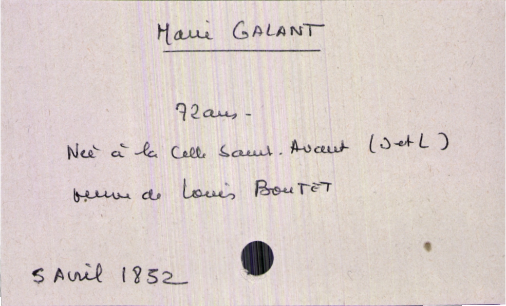 train | Tours | Index cards | c4f4121a-fe99-48af-bec1-a32cd635b0d1 | <root><Décès><Défunt><Nom>Galant</Nom><Prénom>Marie</Prénom><Sexe>F</Sexe><Âge>72 ans</Âge><LieuDeNaissance>La Celle Saint-Avant (Indre et Loire)</LieuDeNaissance><Statut>veuf(ve)</Statut></Défunt><Conjoint><Nom>Boutet</Nom><Prénom>Louis</Prénom></Conjoint></Décès><Année>1852</Année><Mois>avril</Mois><Jour>5</Jour></root> | |