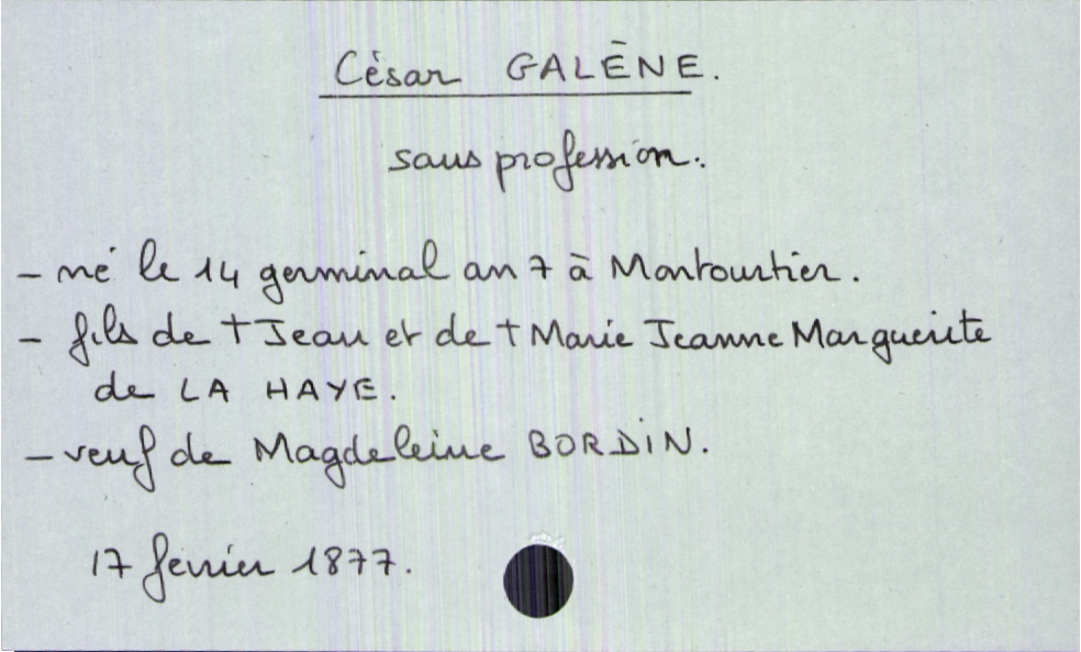 train | Tours | Index cards | 272dcc47-d693-4563-84d2-a98f92b974f5 | <root><Décès><Défunt><Nom>Galène</Nom><Prénom>César</Prénom><Sexe>H</Sexe><DateDeNaissance>14 germinal an 7</DateDeNaissance><LieuDeNaissance>Marmoutier</LieuDeNaissance><Profession>sans profession</Profession><Statut>veuf(ve)</Statut></Défunt><Conjoint><Nom>Bordin</Nom><Prénom>Magdeleine</Prénom></Conjoint><Père><Nom>Galène</Nom><Prénom>Jean</Prénom><Statut>décédé</Statut></Père><Mère><Nom>de La Haye</Nom><Prénom>Marie Jeanne Marguerite</Prénom></Mère></Décès><Année>1877</Année><Mois>fevrier</Mois><Jour>17</Jour></root> | |