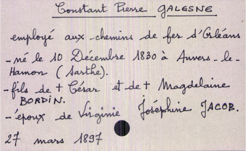 train | Tours | Index cards | 3ab4cc7d-0261-4fde-9ddc-06d7b14f6a55 | <root><Décès><Défunt><Nom>Galesne</Nom><Prénom>Constant Pierre</Prénom><Sexe>H</Sexe><DateDeNaissance>10 décembre 1830</DateDeNaissance><LieuDeNaissance>Auvers-le-Hamon (Sarthe)</LieuDeNaissance><Profession>employé aux chemin de fer d'Orléans</Profession><Statut>marié(e)</Statut></Défunt><Conjoint><Nom>Jacob</Nom><Prénom>Virginie Joséphine</Prénom></Conjoint><Père><Nom>Galesne</Nom><Prénom>César</Prénom><Statut>décédé</Statut></Père><Mère><Nom>Bordin</Nom><Prénom>Magdelaine</Prénom></Mère></Décès><Année>1897</Année><Mois>mars</Mois><Jour>27</Jour></root> | |
