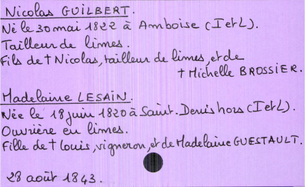 train | Tours | Index cards | 20427873-9981-4974-aa4d-124f1caf785f | <root><Mariage><Marié><Nom>Guilbert</Nom><Prénom>Nicolas</Prénom><Profession>tailleur de limes</Profession><DateDeNaissance>30 mai 1822</DateDeNaissance><LieuDeNaissance>Amboise (Indre et Loire)</LieuDeNaissance><Père><Nom>Guilbert</Nom><Prénom>Nicolas</Prénom><Profession>tailleur de limes</Profession><Statut>décédé</Statut></Père><Mère><Nom>Brossier</Nom><Prénom>Michelle</Prénom><Statut>décédée</Statut></Mère></Marié><Mariée><Nom>Lesain</Nom><Prénom>Madelaine</Prénom><Profession>ouvrière de limes</Profession><DateDeNaissance>18 juin 1820</DateDeNaissance><LieuDeNaissance>Saint Denis Hors (Indre et Loire)</LieuDeNaissance><Père><Nom>Lesain</Nom><Prénom>Louis</Prénom><Profession>vigneron</Profession><Statut>décédé</Statut></Père><Mère><Nom>Guestault</Nom><Prénom>Madelaine</Prénom></Mère></Mariée></Mariage><Année>1843</Année><Mois>août</Mois><Jour>28</Jour></root> | |