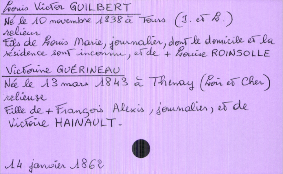 train | Tours | Index cards | e66b0f6d-7093-4500-b2ea-71dde91c0ed8 | <root><Mariage><Marié><Nom>Guilbert</Nom><Prénom>Louis Victor</Prénom><Profession>relieur</Profession><DateDeNaissance>10 novembre 1838</DateDeNaissance><LieuDeNaissance>Tours (Indre-et-Loire)</LieuDeNaissance><Père><Nom>Guilbert</Nom><Prénom>Louis Marie</Prénom><Profession>journalier</Profession></Père><Mère><Nom>Roinsolle</Nom><Prénom>Louise</Prénom><Statut>décédée</Statut></Mère></Marié><Mariée><Nom>Guérineau</Nom><Prénom>Victorine</Prénom><Profession>relieuse</Profession><DateDeNaissance>13 mars 1843</DateDeNaissance><LieuDeNaissance>Thenay (Loir et Cher)</LieuDeNaissance><Père><Nom>Guérineau</Nom><Prénom>François Alexis</Prénom><Profession>journalier</Profession><Statut>décédé</Statut></Père><Mère><Nom>Hainault</Nom><Prénom>Victoire</Prénom></Mère></Mariée></Mariage><Année>1862</Année><Mois>janvier</Mois><Jour>14</Jour></root> | |