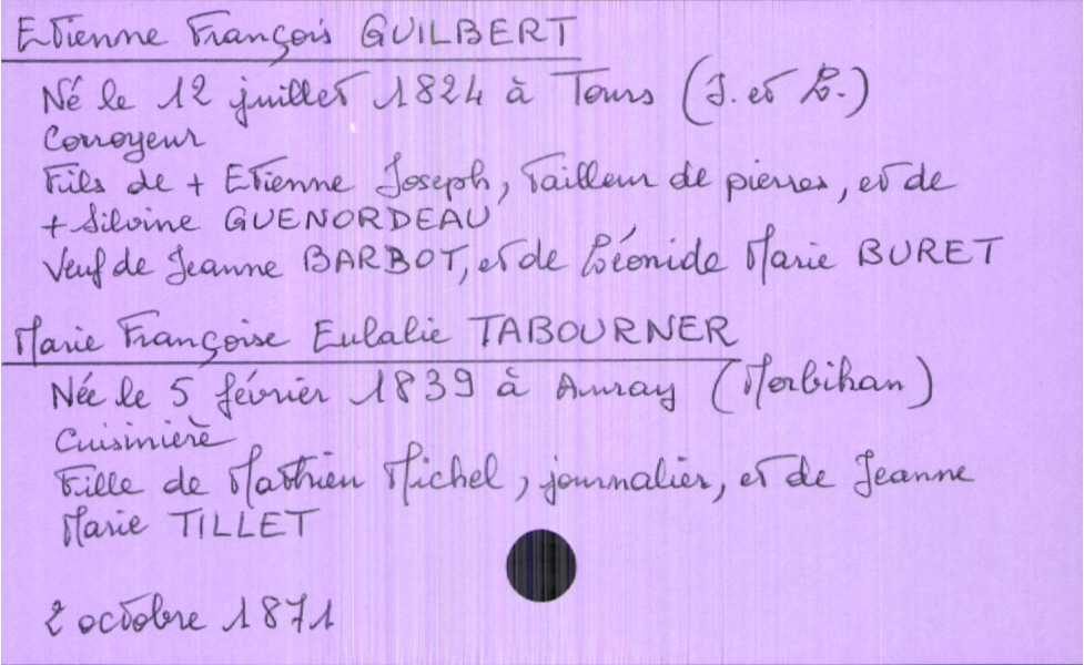 train | Tours | Index cards | 0d833565-a590-464b-8425-28fc7e450a49 | <root><Mariage><Marié><Nom>Guilbert</Nom><Prénom>Etienne François</Prénom><Profession>Corroyeur</Profession><DateDeNaissance>12 juillet 1824</DateDeNaissance><Statut>veuf</Statut><LieuDeNaissance>Tours (Indre et Loire)</LieuDeNaissance><ConjointPremièreNoce><Nom>Bardot</Nom><Prénom>Jeanne</Prénom></ConjointPremièreNoce><Père><Nom>Guilbert</Nom><Prénom>Etienne Joseph</Prénom><Profession>tailleur de pierres</Profession><Statut>décédé</Statut></Père><Mère><Nom>Guenordeau</Nom><Prénom>Silvine</Prénom><Statut>décédée</Statut></Mère></Marié><Mariée><Nom>Tabourner</Nom><Prénom>Françoise Eulalie</Prénom><Profession>Cuisinière</Profession><DateDeNaissance>5 février 1839</DateDeNaissance><LieuDeNaissance>Auray (Morbihan)</LieuDeNaissance><Père><Nom>Tabourner</Nom><Prénom>Mathieu Michel</Prénom><Profession>journalier</Profession></Père><Mère><Nom>Tillet</Nom><Prénom>Jeanne Marie</Prénom></Mère></Mariée></Mariage><Année>1871</Année><Mois>octobre</Mois><Jour>2</Jour><Observations>3e mariage pour le marié : Mariage en seconde noce à Léonide Marie Buret</Observations></root> | |