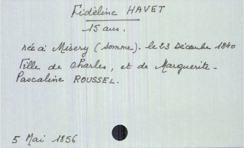 train | Tours | Index cards | 96e6193f-d665-40f2-8235-ea2f4c1cf596 | <root><Décès><Défunt><Nom>Havet</Nom><Prénom>Fidèline</Prénom><Sexe>F</Sexe><Âge>15 ans</Âge><DateDeNaissance>23 décembre 1840</DateDeNaissance><LieuDeNaissance>Misery (Somme)</LieuDeNaissance></Défunt><Père><Nom>Havet</Nom><Prénom>Charles</Prénom></Père><Mère><Nom>Roussel</Nom><Prénom>Marguerite-Pascaline</Prénom></Mère></Décès><Année>1856</Année><Mois>mai</Mois><Jour>5</Jour></root> | |