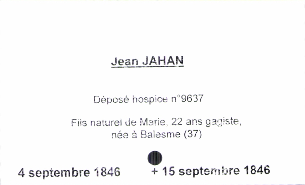 train | Tours | Index cards | 7ab423fd-4c79-4354-9c88-168939bbc9a6 | <root><Baptême><Mère><Nom>Jahan</Nom><Prénom>Marie</Prénom><Profession>gagiste</Profession><LieuDeNaissance>Balesme (37)</LieuDeNaissance><Âge>22 ans</Âge></Mère><Statut>célibataire</Statut><Enfant><Filiation>fils</Filiation><Prénom>Jean</Prénom><DateDeNaissance>4 septembre 1846</DateDeNaissance><DateDeDécès>15 septembre 1846</DateDeDécès></Enfant></Baptême></root> | |