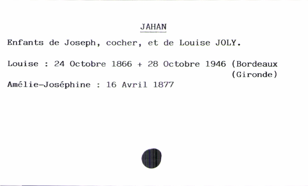 train | Tours | Index cards | c4e5e6b2-4672-4b77-bddf-85b65c771476 | <root><Baptême><Père><Nom>Jahan</Nom><Prénom>Joseph</Prénom><Profession>cocher</Profession></Père><Mère><Nom>Joly</Nom><Prénom>Louise</Prénom></Mère><Enfant><Filiation>fille</Filiation><Prénom>Amélie-Joséphine</Prénom><DateDeNaissance>16 avril 1877</DateDeNaissance><DateDeDécès>28 octobre 1946</DateDeDécès><LieuDeDécès>Bordeaux (Gironde)</LieuDeDécès></Enfant></Baptême></root> | |