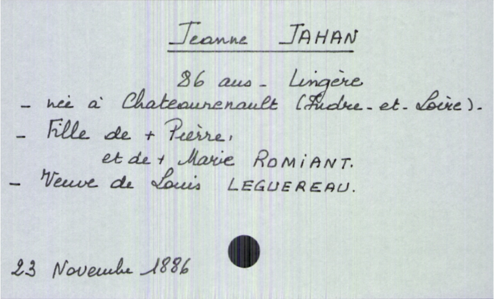 train | Tours | Index cards | 2718b377-1494-44a7-a17c-d6be3d38289c | <root><Décès><Défunt><Nom>Jahan</Nom><Prénom>Jeanne</Prénom><Sexe>F</Sexe><Âge>86 ans</Âge><DateDeNaissance>Chateaurenault (Indre-et-Loire)</DateDeNaissance><Profession>Lingère</Profession><Statut>veuf(ve)</Statut></Défunt><Conjoint><Nom>Leguereau</Nom><Prénom>Louis</Prénom></Conjoint><Père><Nom>Jahan</Nom><Prénom>Pierre</Prénom><Statut>décédé</Statut></Père><Mère><Nom>Romiant</Nom><Prénom>Marie</Prénom><Statut>décédée</Statut></Mère></Décès><Année>1886</Année><Mois>novembre</Mois><Jour>23</Jour></root> | |
