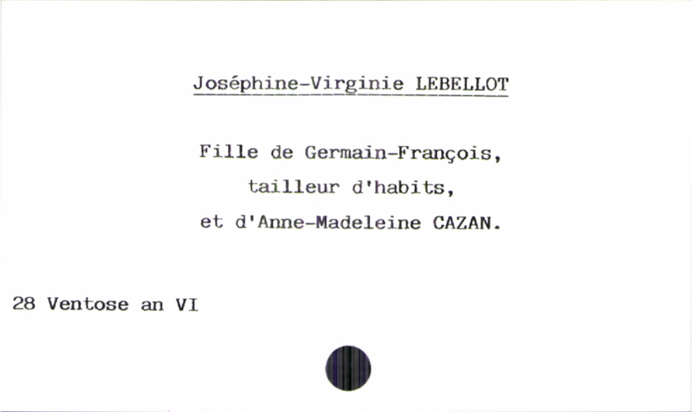 train | Tours | Index cards | e152a55a-15cd-422d-a0ef-63158945a759 | <root><Baptême><Père><Nom>Lebellot</Nom><Prénom>Germain-François</Prénom><Profession>tailleur d'habits</Profession></Père><Mère><Nom>Cazan</Nom><Prénom>Anne-Madeleine</Prénom></Mère><Enfant><Filiation>fille</Filiation><Prénom>Joséphine-Virginie</Prénom><DateDeNaissance>28 ventose an VI</DateDeNaissance></Enfant></Baptême></root> | |