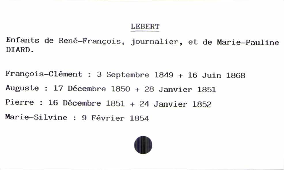 train | Tours | Index cards | d5735ac1-df24-4168-ba6a-52231ded718c | <root><Baptême><Père><Nom>Lebert</Nom><Prénom>René-François</Prénom><Profession>journalier</Profession></Père><Mère><Nom>Diard</Nom><Prénom>Marie-Pauline</Prénom></Mère><Enfant><Filiation>fille</Filiation><Prénom>Marie-Silvine</Prénom><DateDeNaissance>9 février 1854</DateDeNaissance><DateDeDécès>24 janvier 1852</DateDeDécès></Enfant></Baptême></root> | |