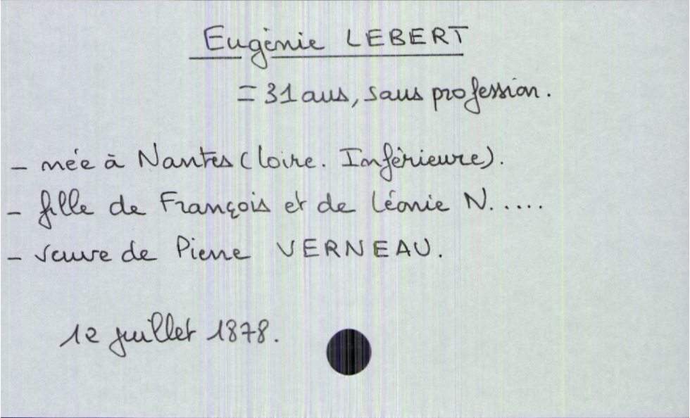 train | Tours | Index cards | 816216ec-4f79-4649-b3cb-90a2c748a3fb | <root><Décès><Défunt><Nom>Lebert</Nom><Prénom>Eugénie</Prénom><Sexe>F</Sexe><Âge>31 ans</Âge><LieuDeNaissance>Nantes (Loire-Inférieure)</LieuDeNaissance><Profession>sans profession</Profession><Statut>veuf(ve)</Statut></Défunt><Conjoint><Nom>Verneau</Nom><Prénom>Pierre</Prénom></Conjoint><Père><Nom>Lebert</Nom><Prénom>François</Prénom></Père><Mère><Nom>N...</Nom><Prénom>Léonie</Prénom></Mère></Décès><Année>1878</Année><Mois>juillet</Mois><Jour>12</Jour><Observations>nom de la mère : non lu</Observations></root> | |