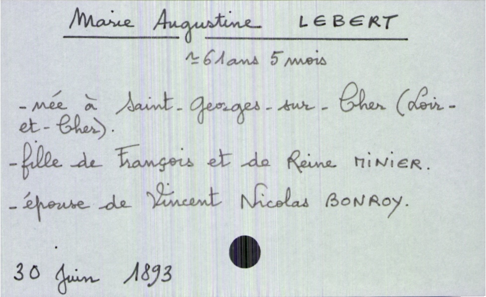 train | Tours | Index cards | c5b907c1-4223-44a7-b335-87abfd0c543b | <root><Décès><Défunt><Nom>Lebert</Nom><Prénom>Marie Augustine</Prénom><Sexe>F</Sexe><Âge>61 ans 5 mois</Âge><LieuDeNaissance>Saint-Georges-sur-Cher (Loir-et-Cher)</LieuDeNaissance><Statut>marié(e)</Statut></Défunt><Conjoint><Nom>Bonroy</Nom><Prénom>Vincent Nicolas</Prénom></Conjoint><Père><Nom>Lebert</Nom><Prénom>François</Prénom></Père><Mère><Nom>Minier</Nom><Prénom>Reine</Prénom></Mère></Décès><Année>1893</Année><Mois>juin</Mois><Jour>30</Jour></root> | |
