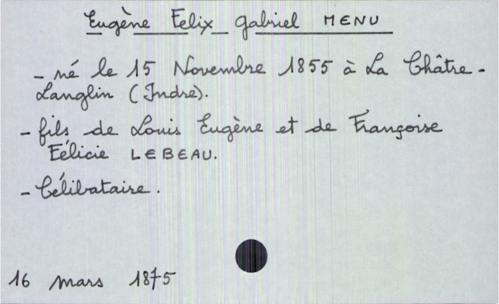 train | Tours | Index cards | ce071112-40fe-4111-8eb7-9d8d53330fbb | <root><Décès><Défunt><Nom>Menu</Nom><Prénom>Eugène Felix Gabriel</Prénom><Sexe>H</Sexe><DateDeNaissance>15 novembre 1855</DateDeNaissance><LieuDeNaissance>La Châtre-Langlin (Indre)</LieuDeNaissance><Statut>célibataire</Statut></Défunt><Père><Nom>Menu</Nom><Prénom>Louis Eugène</Prénom></Père><Mère><Nom>Lebeau</Nom><Prénom>Françoise Félicie</Prénom></Mère></Décès><Année>1875</Année><Mois>mars</Mois><Jour>16</Jour></root> | |