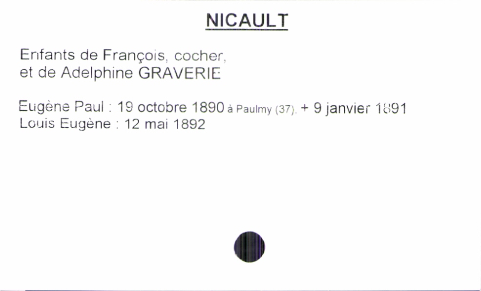 train | Tours | Index cards | f1888156-f748-4b94-8758-de2e67e797db | <root><Baptême><Père><Nom>Nicault</Nom><Prénom>François</Prénom><Profession>cocher</Profession></Père><Mère><Nom>Graverie</Nom><Prénom>Adelphine</Prénom></Mère><Enfant><Filiation>fils</Filiation><Prénom>Louis Eugène</Prénom><DateDeNaissance>12 mai 1892</DateDeNaissance><LieuDeNaissance>Paulmy (37)</LieuDeNaissance><DateDeDécès>9 janvier 1891</DateDeDécès></Enfant></Baptême></root> | |
