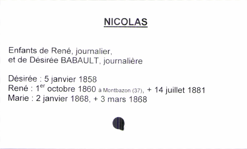 train | Tours | Index cards | fc206ba1-ec8c-4553-ab27-84b1439e855d | <root><Baptême><Père><Nom>Nicolas</Nom><Prénom>René</Prénom><Profession>journalier</Profession></Père><Mère><Nom>Babault</Nom><Prénom>Désirée</Prénom><Profession>journalière</Profession></Mère><Enfant><Filiation>fille</Filiation><Prénom>Marie</Prénom><DateDeNaissance>2 janvier 1868</DateDeNaissance><LieuDeNaissance>Montbazon (37)</LieuDeNaissance><DateDeDécès>3 mars 1868</DateDeDécès></Enfant></Baptême></root> | |