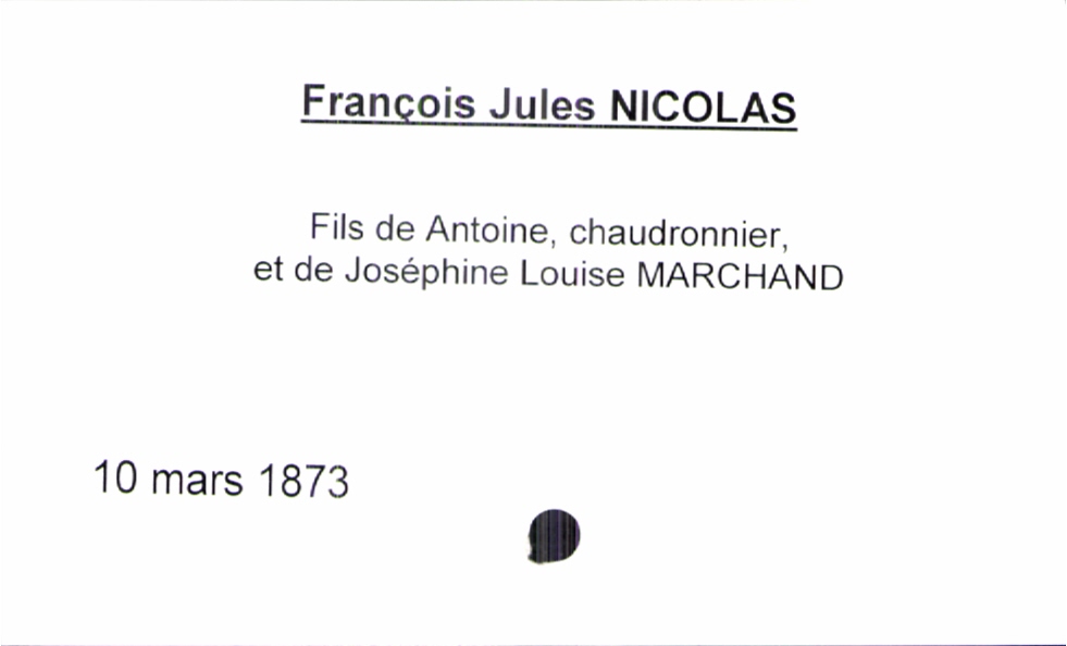 train | Tours | Index cards | 25831f2c-3766-4677-ba9c-d1137c699fd8 | <root><Baptême><Père><Nom>Nicolas</Nom><Prénom>Antoine</Prénom><Profession>chaudronnier</Profession></Père><Mère><Nom>Marchand</Nom><Prénom>Joséphine Louise</Prénom></Mère><Enfant><Filiation>fils</Filiation><Prénom>François Jules</Prénom><DateDeNaissance>10 mars 1873</DateDeNaissance></Enfant></Baptême></root> | |