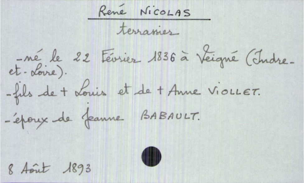 train | Tours | Index cards | 4cd1cec6-6e76-42fb-8eef-479c575ccaa3 | <root><Décès><Défunt><Nom>Nicolas</Nom><Prénom>René</Prénom><Sexe>H</Sexe><DateDeNaissance>22 février 1836</DateDeNaissance><LieuDeNaissance>Veigné (Indre-et-Loire)</LieuDeNaissance><Profession>terrassier</Profession><Statut>marié(e)</Statut></Défunt><Conjoint><Nom>Babault</Nom><Prénom>Jeanne</Prénom></Conjoint><Père><Nom>Nicolas</Nom><Prénom>Louis</Prénom><Statut>décédé</Statut></Père><Mère><Nom>Viollet</Nom><Prénom>Anne</Prénom><Statut>décédée</Statut></Mère></Décès><Année>1893</Année><Mois>août</Mois><Jour>8</Jour></root> | |