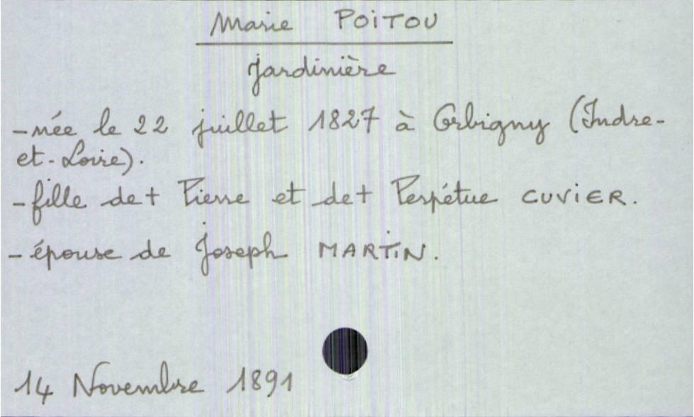 train | Tours | Index cards | 9216f04b-4b71-4ad8-8847-0837026b497a | <root><Décès><Défunt><Nom>Poitou</Nom><Prénom>Marie</Prénom><Sexe>F</Sexe><DateDeNaissance>22 juillet 1827</DateDeNaissance><LieuDeNaissance>Orbigny (Indre-et-Loire)</LieuDeNaissance><Profession>jardinière</Profession><Statut>marié(e)</Statut></Défunt><Conjoint><Nom>Martin</Nom><Prénom>Joseph</Prénom></Conjoint><Père><Nom>Poitou</Nom><Prénom>Pierre</Prénom><Statut>décédé</Statut></Père><Mère><Nom>Cuvier</Nom><Prénom>Perpétue</Prénom><Statut>décédée</Statut></Mère></Décès><Année>1891</Année><Mois>novembre</Mois><Jour>14</Jour></root> | |