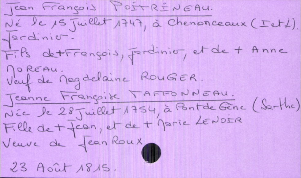 train | Tours | Index cards | 211fde53-2e56-46aa-839f-e732565659d5 | <root><Mariage><Marié><Nom>Poitrineau</Nom><Prénom>Jean François</Prénom><Profession>jardinier</Profession><DateDeNaissance>15 juillet 1747</DateDeNaissance><Statut>veuf</Statut><LieuDeNaissance>Chenonceaux (Indre et Loire)</LieuDeNaissance><ConjointPremièreNoce><Nom>Rouger</Nom><Prénom>Magdelaine</Prénom></ConjointPremièreNoce><Père><Nom>Poitrineau</Nom><Prénom>François</Prénom><Profession>jardinier</Profession><Statut>décédé</Statut></Père><Mère><Nom>Moreau</Nom><Prénom>Anne</Prénom><Statut>décédée</Statut></Mère></Marié><Mariée><Nom>Taffonneau</Nom><Prénom>Jeanne Françoise</Prénom><DateDeNaissance>28 juillet 1754</DateDeNaissance><Statut>veuve</Statut><LieuDeNaissance>Pont de Gêne (Sarthe)</LieuDeNaissance><ConjointPremièreNoce><Nom>Roux</Nom><Prénom>Jean</Prénom></ConjointPremièreNoce><Père><Nom>Taffoneau</Nom><Prénom>Jean</Prénom><Statut>décédé</Statut></Père><Mère><Nom>Lenoir</Nom><Prénom>Marie</Prénom><Statut>décédée</Statut></Mère></Mariée></Mariage><Année>1815</Année><Mois>août</Mois><Jour>23</Jour></root> | |