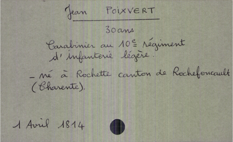 train | Tours | Index cards | 277e9a79-d66f-4a49-bc20-99f87623de12 | <root><Décès><Défunt><Nom>Poixvert</Nom><Prénom>Jean</Prénom><Sexe>H</Sexe><Âge>30 ans</Âge><LieuDeNaissance>Rochette canton de Rochefoucault (Charente)</LieuDeNaissance><Profession>carabinier au 10e régiment d'infanterie légère</Profession></Défunt></Décès><Année>1814</Année><Mois>avril</Mois><Jour>1</Jour></root> | |