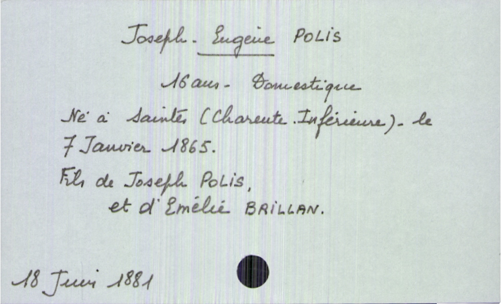 train | Tours | Index cards | 80b22301-aff1-40db-8299-022c458ad2d0 | <root><Décès><Défunt><Nom>Polis</Nom><Prénom>Joseph Eugène</Prénom><Sexe>H</Sexe><Âge>16 ans</Âge><DateDeNaissance>7 janvier 1865</DateDeNaissance><LieuDeNaissance>Saintes (Charente-Inférieure)</LieuDeNaissance><Profession>domestique</Profession></Défunt><Père><Nom>Polis</Nom><Prénom>Joseph</Prénom></Père><Mère><Nom>Baillan</Nom><Prénom>Emélie</Prénom></Mère></Décès><Année>1881</Année><Mois>juin</Mois><Jour>18</Jour></root> | |