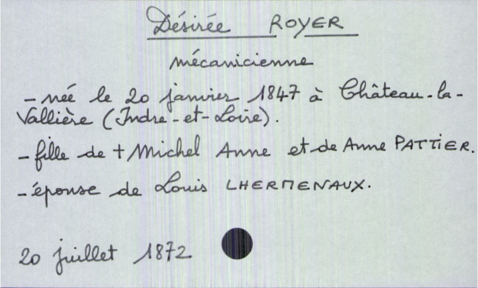 train | Tours | Index cards | dc311a54-e4dc-4742-99f8-0dd4f023d741 | <root><Décès><Défunt><Nom>Royer</Nom><Prénom>Désirée</Prénom><Sexe>F</Sexe><DateDeNaissance>20 janvier 1847</DateDeNaissance><LieuDeNaissance>Château-la-Vallière</LieuDeNaissance><Profession>mécanicienne</Profession><Statut>marié(e)</Statut></Défunt><Conjoint><Nom>Lhermenaux</Nom><Prénom>Louis</Prénom></Conjoint><Père><Nom>Royer</Nom><Prénom>Michel Anne</Prénom><Statut>décédé</Statut></Père><Mère><Nom>Pattier</Nom><Prénom>Anne</Prénom></Mère></Décès><Année>1872</Année><Mois>juillet</Mois><Jour>20</Jour></root> | |