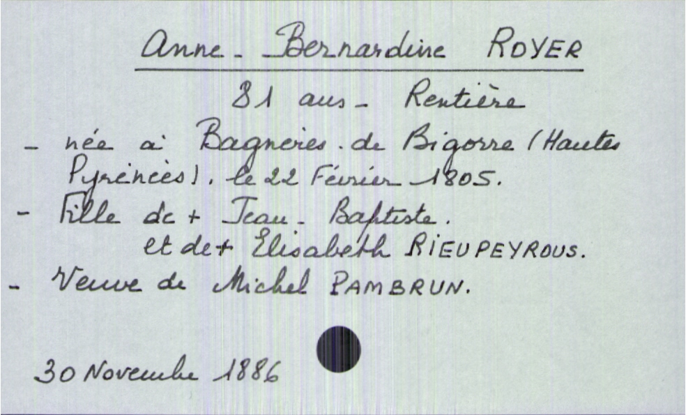 train | Tours | Index cards | 94fdf1d1-ad66-418f-863d-0c54922159f2 | <root><Décès><Défunt><Nom>Royer</Nom><Prénom>Anne-Bernardine</Prénom><Sexe>F</Sexe><Âge>81 ans</Âge><DateDeNaissance>22 février 1805</DateDeNaissance><LieuDeNaissance>Bannières-de-Bigorre (Hautes Pyrénées)</LieuDeNaissance><Statut>veuf(ve)</Statut></Défunt><Conjoint><Nom>Pamprun</Nom><Prénom>Michel</Prénom><Statut>décédé(e)</Statut></Conjoint><Père><Nom>Royer</Nom><Prénom>Jean-Baptiste</Prénom><Statut>décédé</Statut></Père><Mère><Nom>Rieupeyrous</Nom><Prénom>Elisabeth</Prénom><Statut>décédée</Statut></Mère></Décès><Année>1886</Année><Mois>novembre</Mois><Jour>30</Jour></root> | |