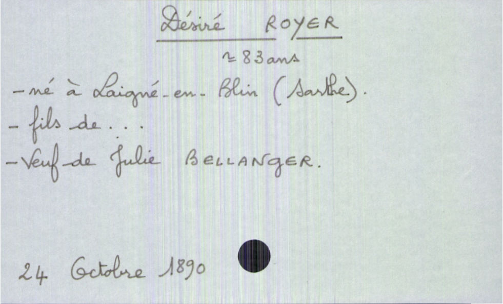 train | Tours | Index cards | 3520a1a5-b9cd-4623-8f7a-939e59ab5339 | <root><Décès><Défunt><Nom>Royer</Nom><Prénom>Désiré</Prénom><Sexe>H</Sexe><Âge>83 ans</Âge><LieuDeNaissance>Laigné-en-Blin (Sarthe)</LieuDeNaissance><Statut>veuf(ve)</Statut></Défunt><Conjoint><Nom>Bellanger</Nom><Prénom>Julie</Prénom><Statut>décédé(e)</Statut></Conjoint></Décès><Année>1890</Année><Mois>octobre</Mois><Jour>24</Jour></root> | |