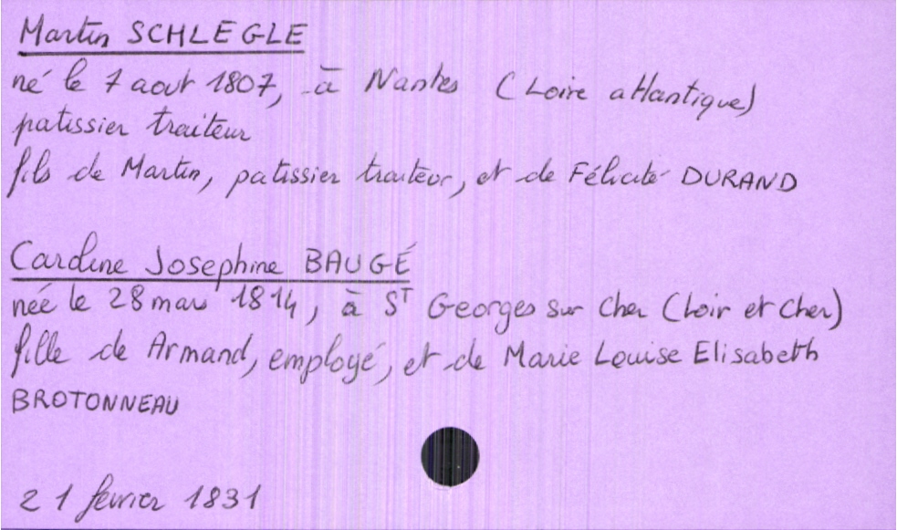 train | Tours | Index cards | 266fd86f-a696-42b0-bc3f-6c3aac9de90a | <root><Mariage><Marié><Nom>Schlegle</Nom><Prénom>Martin</Prénom><Profession>patissier traiteur</Profession><DateDeNaissance>7 août 1807</DateDeNaissance><LieuDeNaissance>Nantes (Loire atlantique)</LieuDeNaissance><Père><Nom>Schlegle</Nom><Prénom>Martin</Prénom><Profession>patissier traiteur</Profession></Père><Mère><Nom>Durand</Nom><Prénom>Félicité</Prénom></Mère></Marié><Mariée><Nom>Baugé</Nom><Prénom>Caroline Josephine</Prénom><DateDeNaissance>28 mars 1814</DateDeNaissance><LieuDeNaissance>Saint Georges sur Cher (Loir et Cher)</LieuDeNaissance><Père><Nom>Baugé</Nom><Prénom>Armand</Prénom></Père><Mère><Nom>Brotonneau</Nom><Prénom>Marie Louise Elisabeth</Prénom></Mère></Mariée></Mariage><Année>1831</Année><Mois>fevrier</Mois><Jour>21</Jour></root> | |