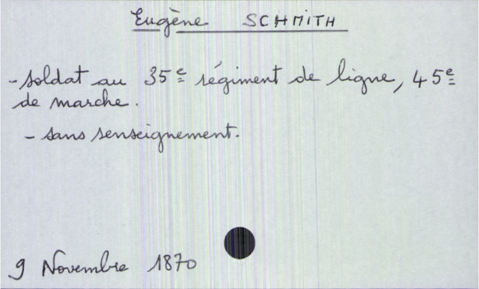 train | Tours | Index cards | 5cf29201-c2b8-4420-ae8b-2d572ea6dee8 | <root><Décès><Défunt><Nom>Schmith</Nom><Prénom>Eugène</Prénom><Sexe>H</Sexe><Profession>soldat au 35e régiment de ligne, 45e de marche</Profession></Défunt></Décès><Année>1870</Année><Mois>novembre</Mois><Jour>9</Jour></root> | |