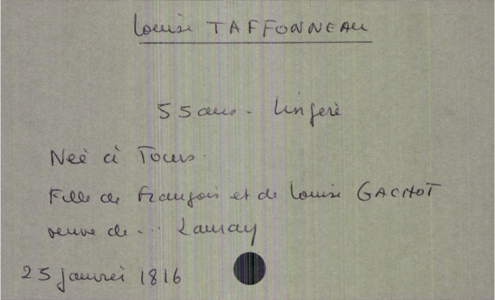 train | Tours | Index cards | 395b3921-54f4-4ae1-b037-62e2878e2719 | <root><Décès><Défunt><Nom>Taffonneau</Nom><Prénom>Louise</Prénom><Sexe>F</Sexe><Âge>55 ans</Âge><LieuDeNaissance>Tours</LieuDeNaissance><Profession>lingère</Profession><Statut>veuf(ve)</Statut></Défunt><Conjoint><Nom>Lauraly</Nom></Conjoint><Père><Nom>Taffonneau</Nom><Prénom>François</Prénom></Père><Mère><Nom>Gachot</Nom><Prénom>Louise</Prénom></Mère></Décès><Année>1816</Année><Mois>janvier</Mois><Jour>25</Jour></root> | |