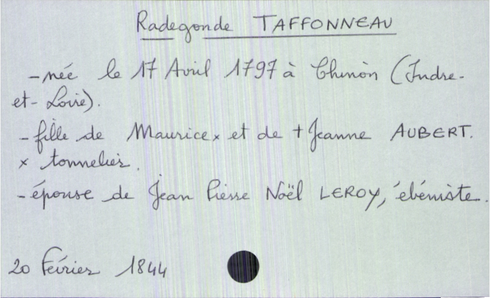train | Tours | Index cards | b6a488bc-8e5f-45ce-8503-71485fd6970d | <root><Décès><Défunt><Nom>Taffonneau</Nom><Prénom>Radegonde</Prénom><Sexe>F</Sexe><DateDeNaissance>17 avril 1797</DateDeNaissance><LieuDeNaissance>Chinon (Indre-et-Loire)</LieuDeNaissance><Statut>marié(e)</Statut></Défunt><Conjoint><Nom>Leroy</Nom><Prénom>Jean Pierre Noël</Prénom><Profession>ébéniste</Profession></Conjoint><Père><Nom>Taffonneau</Nom><Prénom>Maurice</Prénom><Profession>tonnelier</Profession></Père><Mère><Nom>Aubert</Nom><Prénom>Jeanne</Prénom><Statut>décédée</Statut></Mère></Décès><Année>1844</Année><Mois>février</Mois><Jour>20</Jour></root> | |