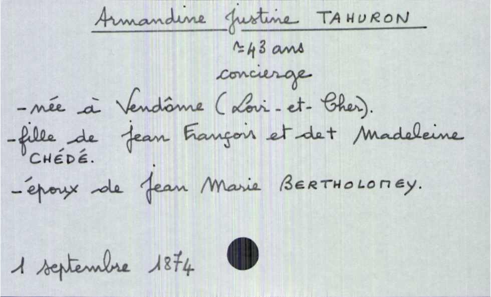 train | Tours | Index cards | d4f714e2-168a-49e6-a7ef-fad452085b26 | <root><Décès><Défunt><Nom>Tahuron</Nom><Prénom>Armandine Justine</Prénom><Sexe>F</Sexe><Âge>43 ans</Âge><LieuDeNaissance>Vendôme (Loir-et-Cher)</LieuDeNaissance><Profession>concierge</Profession><Statut>marié(e)</Statut></Défunt><Conjoint><Nom>Bertholomey</Nom><Prénom>Jean Marie</Prénom></Conjoint><Père><Nom>Tahuron</Nom><Prénom>Jean François</Prénom></Père><Mère><Nom>Chédé</Nom><Prénom>Madeleine</Prénom></Mère></Décès><Année>1874</Année><Mois>septembre</Mois><Jour>1</Jour></root> | |