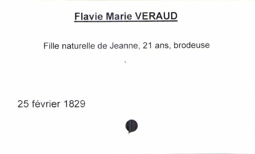 train | Tours | Index cards | ab52a2fb-bb50-4775-b01e-23f121d531b6 | <root><Baptême><Mère><Nom>Veraud</Nom><Prénom>Jeanne</Prénom><Profession>brodeuse</Profession><Âge>21 ans</Âge></Mère><Statut>célibataire</Statut><Enfant><Filiation>fille</Filiation><Prénom>Flavie Marie</Prénom><DateDeNaissance>25 février 1829</DateDeNaissance></Enfant></Baptême></root> | |