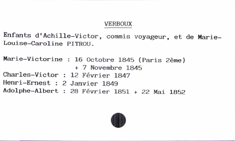 train | Tours | Index cards | a79ec817-52c2-4fa2-b988-ef6fb0fbabc9 | <root><Baptême><Père><Nom>Verboux</Nom><Prénom>Achille-Victor</Prénom><Profession>commis voyageur</Profession></Père><Mère><Nom>Pitrou</Nom><Prénom>Marie-Louis-Caroline</Prénom></Mère><Enfant><Filiation>fils</Filiation><Prénom>Adolphe-Albert</Prénom><DateDeNaissance>28 février 1851</DateDeNaissance><LieuDeNaissance>Paris 2ème</LieuDeNaissance><DateDeDécès>22 mai 1852</DateDeDécès></Enfant></Baptême></root> | |