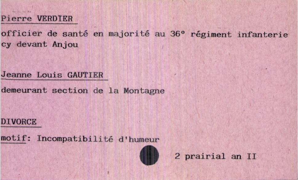 train | Tours | Index cards | 5f644565-37b5-4587-b01d-eb7340e8ce8c | <root><Mariage><Marié><Nom>Verdier</Nom><Prénom>Pierre</Prénom><Profession>officier de santé en majorité au 36° régiment infanterie cy devant Anjou</Profession></Marié><Mariée><Nom>Gautier</Nom><Prénom>Jeanne Louis</Prénom><LieuDeVie>section de la Montagne</LieuDeVie></Mariée></Mariage><Année>an II</Année><Mois>prairial</Mois><Jour>2</Jour><Observations>Divorce motif : incompatibilité d'humeur</Observations></root> | |