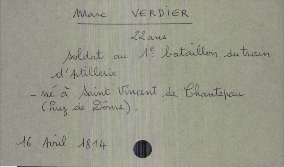 train | Tours | Index cards | ef49a6e7-0e96-422a-b3f4-3a8610cb5c3e | <root><Décès><Défunt><Nom>Verdier</Nom><Prénom>Marc</Prénom><Sexe>H</Sexe><Âge>22 ans</Âge><LieuDeNaissance>Saint Vincent de Chantepau (Puy de Dôme)</LieuDeNaissance><Profession>soldat au 1e bataillon du train d'artillerie</Profession></Défunt></Décès><Année>1814</Année><Mois>avril</Mois><Jour>16</Jour></root> | |