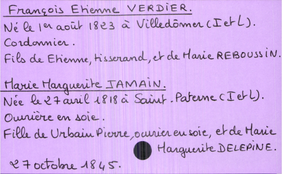 train | Tours | Index cards | c1acf182-cac5-41b6-b9da-f71d0003e619 | <root><Mariage><Marié><Nom>Verdier</Nom><Prénom>François Etienne</Prénom><Profession>cordonnier</Profession><DateDeNaissance>1er août 1823</DateDeNaissance><LieuDeNaissance>Villedômer (Indre et Loire)</LieuDeNaissance><Père><Nom>Verdier</Nom><Prénom>Etienne</Prénom><Profession>tisserand</Profession></Père><Mère><Nom>Reboussin</Nom><Prénom>Marie</Prénom></Mère></Marié><Mariée><Nom>Jamain</Nom><Prénom>Marie Marguerite</Prénom><Profession>ouvrière en soie</Profession><DateDeNaissance>27 avril 1818</DateDeNaissance><LieuDeNaissance>Saint-Paterne (Indre et Loire)</LieuDeNaissance><Père><Nom>Jamain</Nom><Prénom>Urbain Pierre</Prénom><Profession>ouvrier en soie</Profession></Père><Mère><Nom>Delepine</Nom><Prénom>Marie Marguerite</Prénom></Mère></Mariée></Mariage><Année>1845</Année><Mois>octobre</Mois><Jour>27</Jour></root> | |