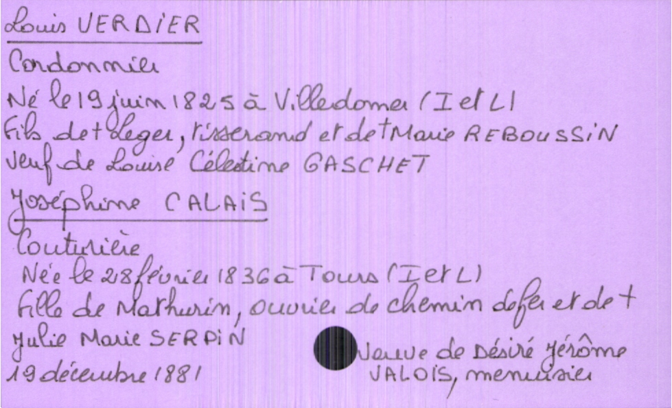 train | Tours | Index cards | 4deaf1c6-4dae-48e4-ba1b-96ee7828b6a8 | <root><Mariage><Marié><Nom>Verdier</Nom><Prénom>Louis</Prénom><Profession>cordonnier</Profession><DateDeNaissance>19 juin 1825</DateDeNaissance><Statut>veuf</Statut><LieuDeNaissance>Villdomer (Indre et Loire)</LieuDeNaissance><ConjointPremièreNoce><Nom>Gaschet</Nom><Prénom>Louise Célestine</Prénom></ConjointPremièreNoce><Père><Nom>Verdier</Nom><Prénom>Leger</Prénom><Profession>tisserand</Profession><Statut>décédé</Statut></Père><Mère><Nom>Reboussin</Nom><Prénom>Marie</Prénom><Statut>décédée</Statut></Mère></Marié><Mariée><Nom>Calais</Nom><Prénom>Joséphine</Prénom><Profession>couturière</Profession><DateDeNaissance>28 février 1836</DateDeNaissance><Statut>veuve</Statut><LieuDeNaissance>Tours (Indre et Loire)</LieuDeNaissance><ConjointPremièreNoce><Nom>Valois</Nom><Prénom>Désiré Jérôme</Prénom><Profession>menuisier</Profession></ConjointPremièreNoce><Père><Nom>Calais</Nom><Prénom>Mathurin</Prénom><Profession>ouvrier de chemin de fer</Profession></Père><Mère><Nom>Serpin</Nom><Prénom>Julie Marie</Prénom><Statut>décédée</Statut></Mère></Mariée></Mariage><Année>1881</Année><Mois>décembre</Mois><Jour>19</Jour></root> | |