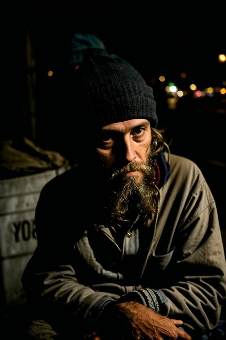 - close up of a homeless man, sitting near a dumpster, looking into the aley, dirty face, beard, worn beanie