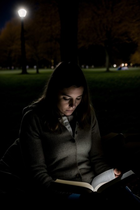 - woman reading a book in the park, flashlight , close up