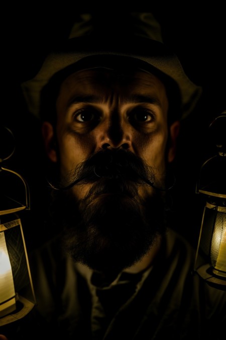 - man holding a lantern, close up, shocked, mustache